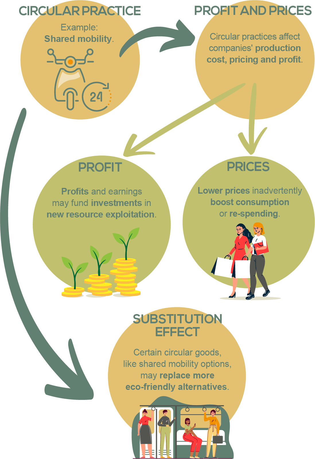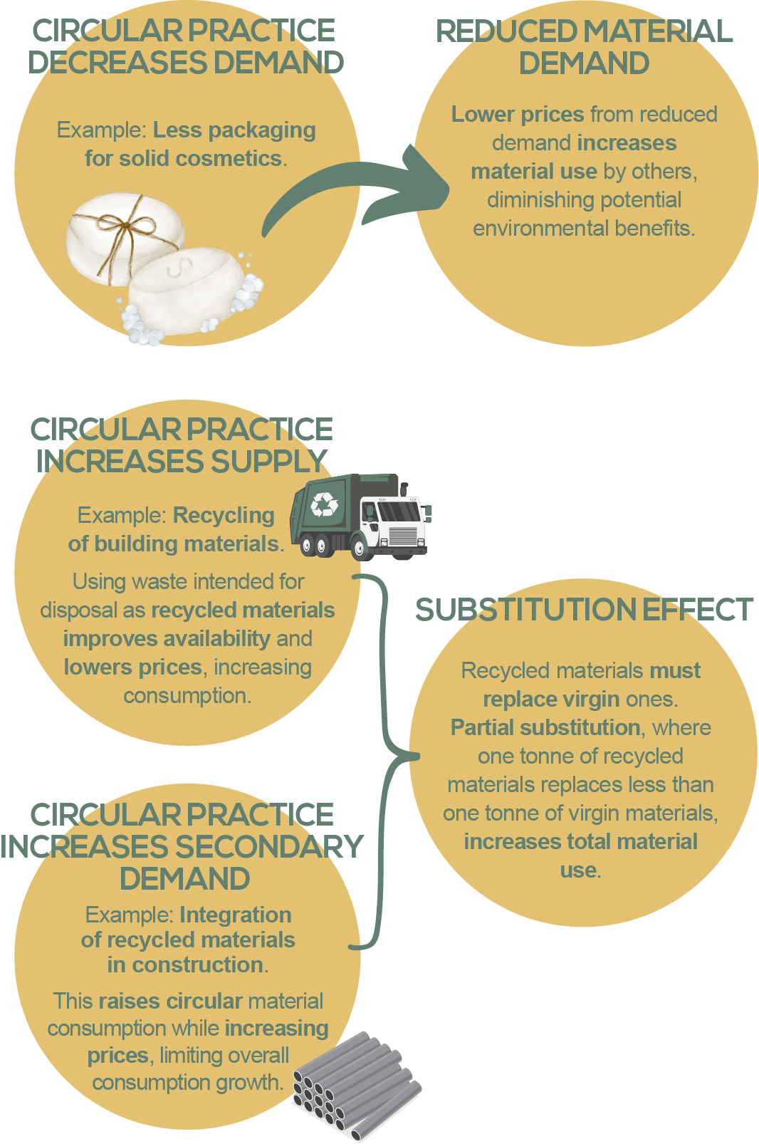 Companies integrating recycled materials or refurbished goods into their production processes contribute to greater demand for circular resources. This demand can raise prices, further incentivising the collection and processing of waste materials and limiting the increase in consumption. What is essential, again, is whether this increased consumption of circular goods replaces the demand for non-circular goods, the substitution effect.