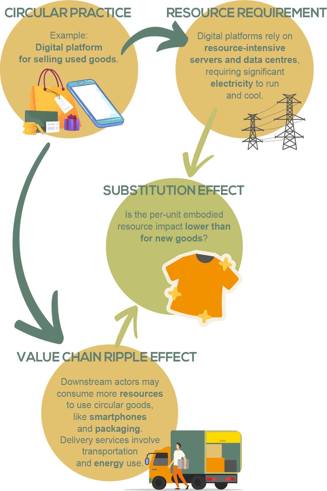 In particular, the value chain ripple effect includes how customers and downstream partners require resources to access or consume circular products or services. For instance, if customers spend additional time and resources accessing circular options (like driving further to zero-waste stores), these factors can offset intended resource savings.