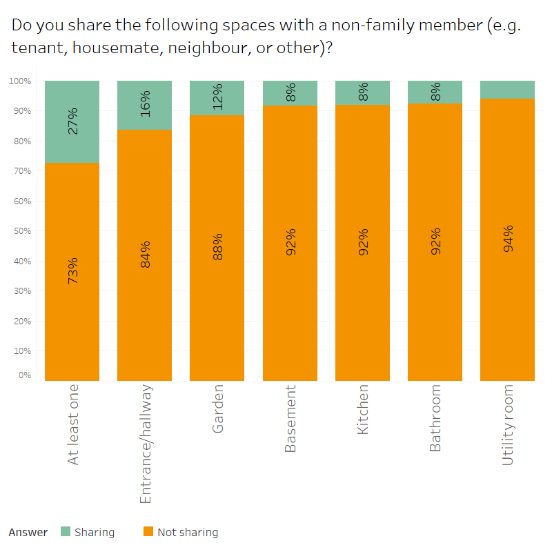Survey respondents have been asked whether they currently share spaces with a non-family member (e.g., tenant, housemate, neighbour, other). Consumers’ current sharing of their living spaces varies by the privacy level of the different areas: 16% share entrances, 12% share gardens, and only 8% share kitchens or bathrooms. Overall few consumers share their living spaces with non-family members (73% non of the mentioned spaces).
